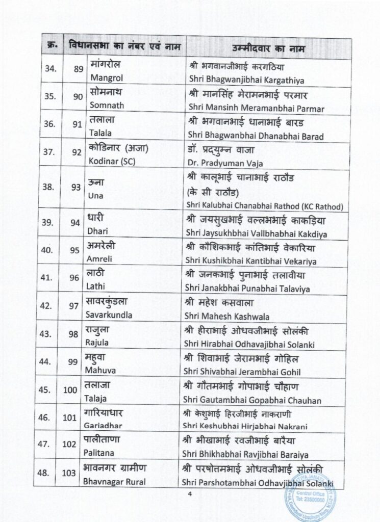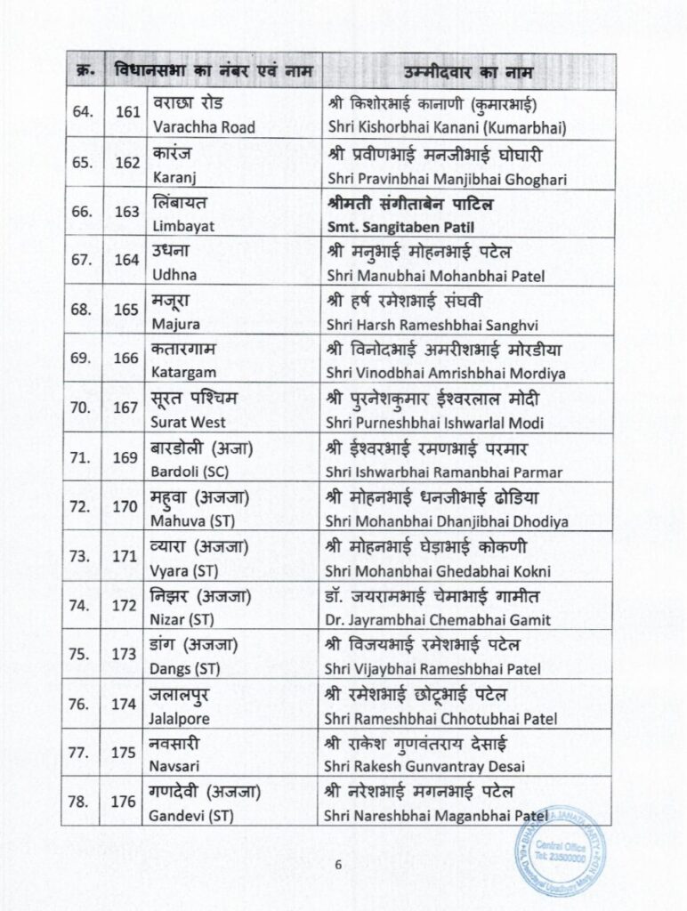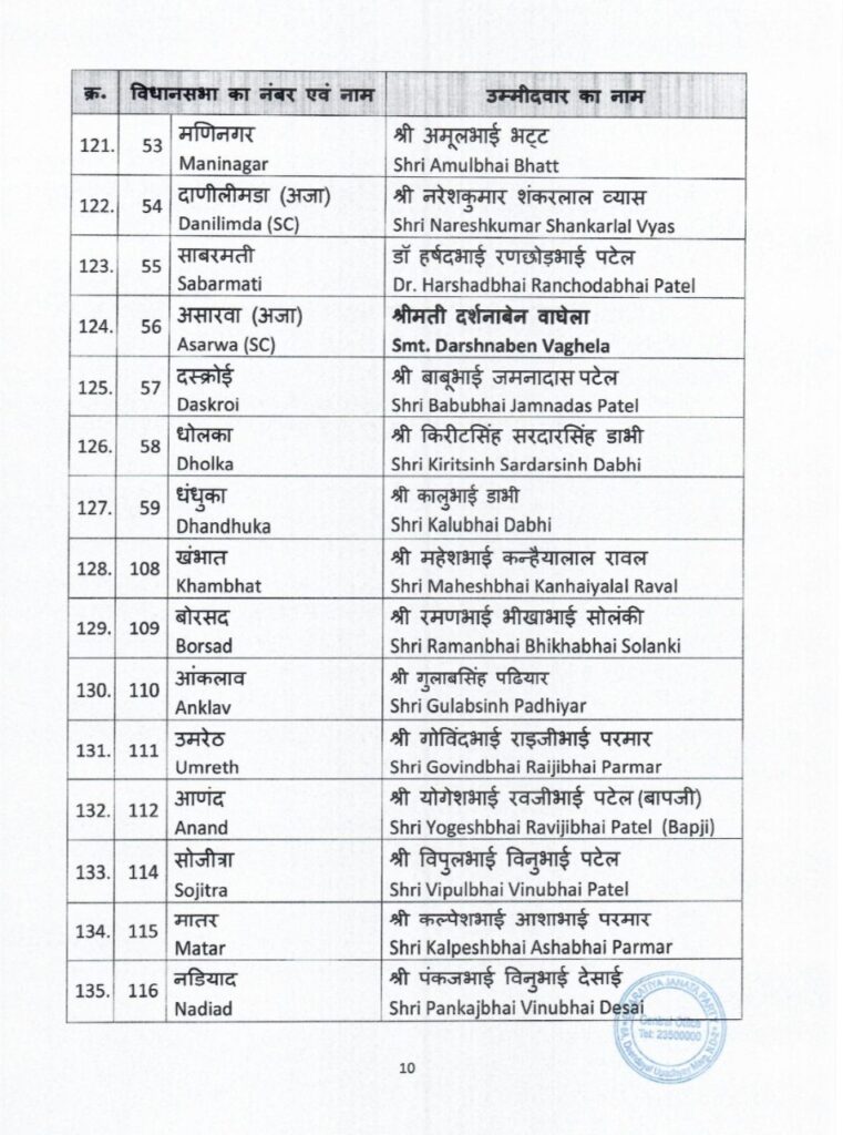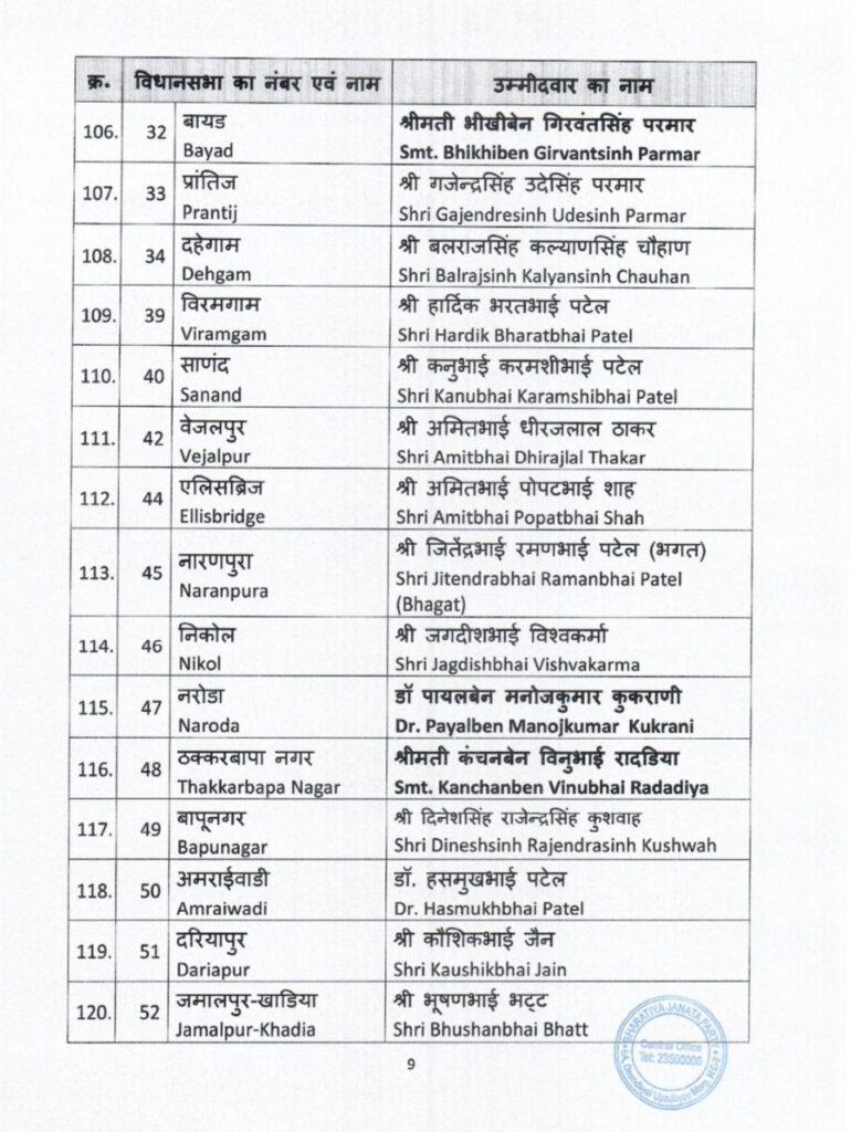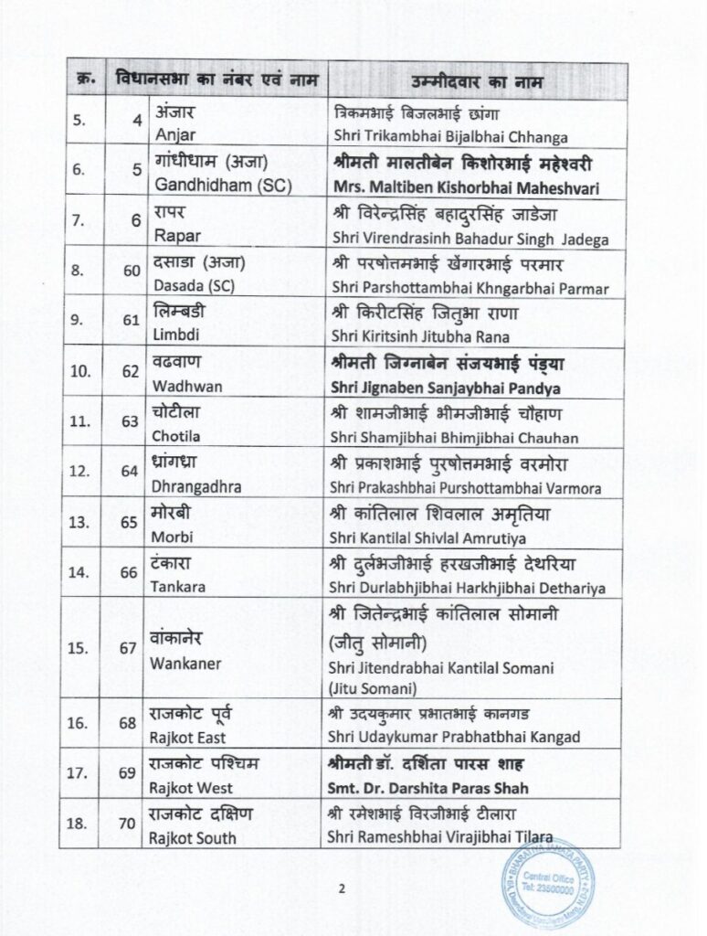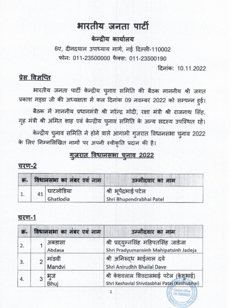 भारतीय जनता पार्टी ने गुजरात में विधानसभा चुनाव के लिए उम्मीदवारों की पहली सूची का ऐलान कर दिया