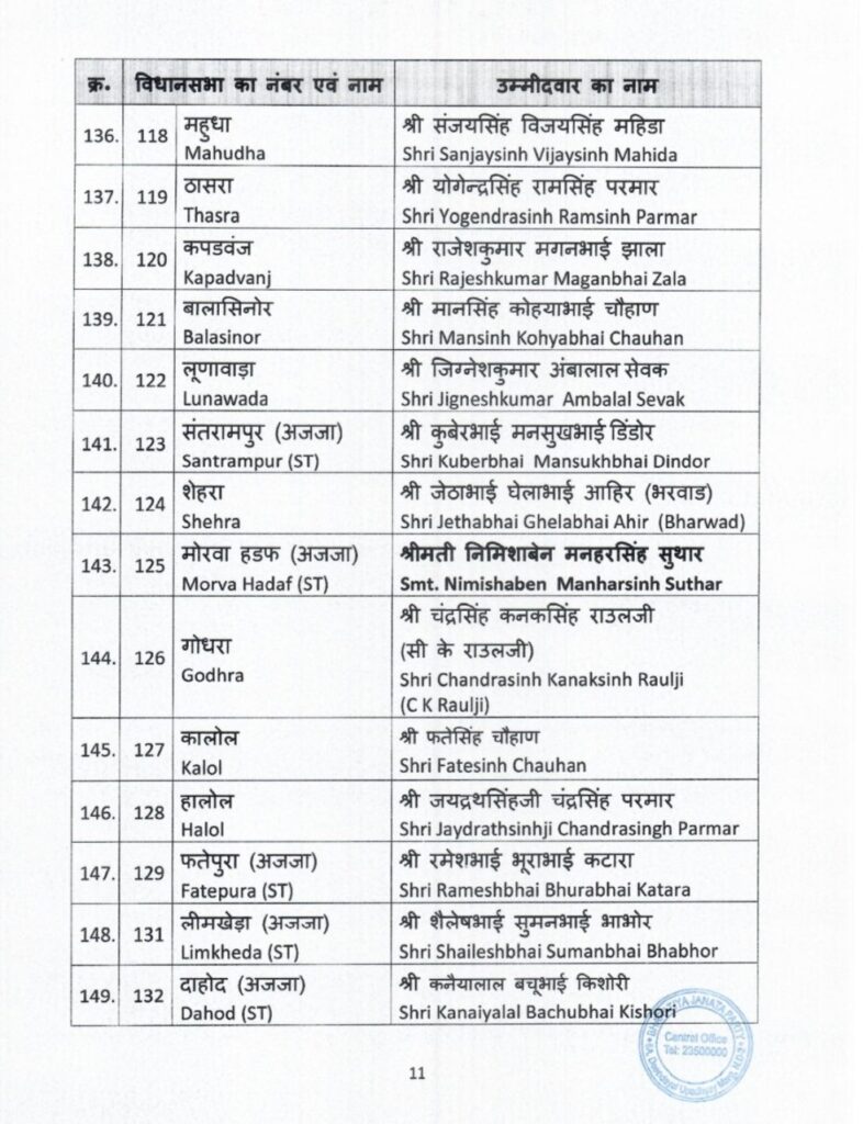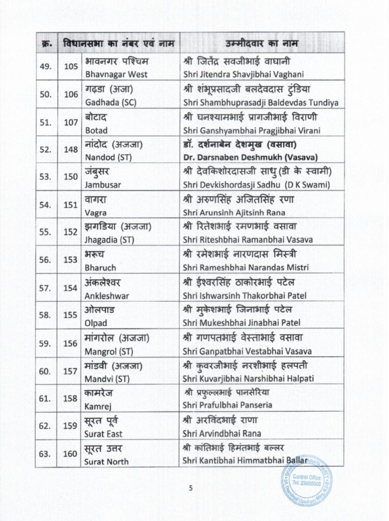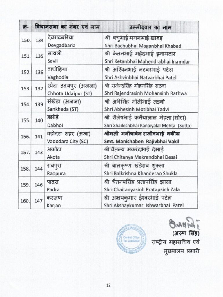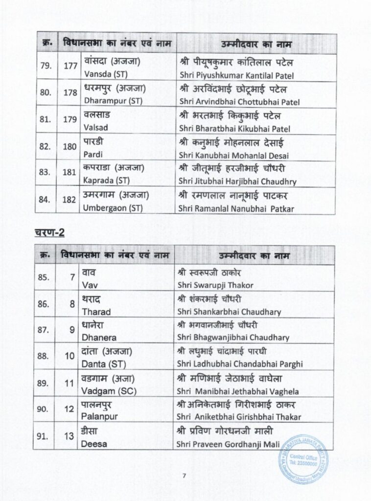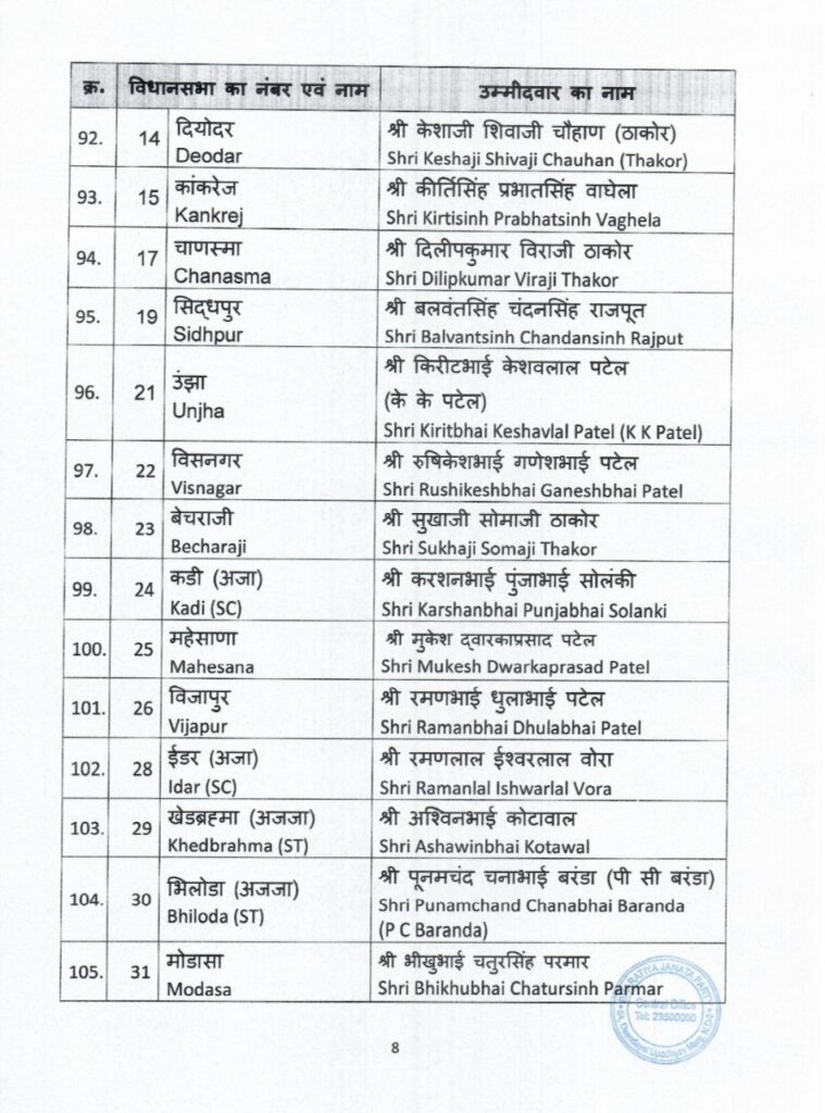 भारतीय जनता पार्टी ने गुजरात में विधानसभा चुनाव के लिए उम्मीदवारों की पहली सूची का ऐलान कर दिया