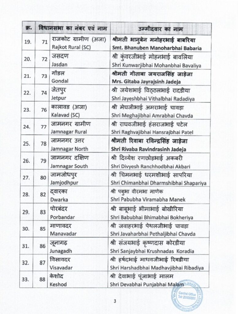 मुख्यमंत्री भूपेंद्र पटेल को घाटलोढिया सीट से उम्मीदवार बनाया गया है। मांडवी से अनिरुद्ध भाई को टिकट दिया गया है तो हाल ही में पुल हादसा देखने वाले मोरबी से कांतिलाल पर भरोसा जताया गया है। अंजार से त्रिकम भाई और गांधीधाम से मालती बेन को प्रत्याशी बनाया गया है। जाम नगर नॉर्थ से रविंद्र जाडेजा की पत्नी रिवाबा को टिकट दिया गया है। जामनगर ग्रामीण से राघव जी को उतारा गया है।