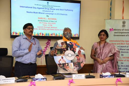 केन्द्रीय सामाजिक न्याय एवं अधिकारिता राज्य मंत्री श्री रतन लाल कटारिया ने “अंतरराष्ट्रीय मादक पदार्थ सेवन और तस्करी निरोध दिवस” के अवसर पर आज यहां “सबसे ज्यादा प्रभावित 272 जिलों के लिए नशा मुक्त भारत : वार्षिक कार्य योजना (2020-21)” का ई-शुभारम्भ किया। इस अवसर पर उन्होंने नशीले पदार्थों की मांग में कमी के लिए राष्ट्रीय कार्य योजना से संबंधित लोगो और टैगलाइन तथा नशीली दवाओं के दुरुपयोग को रोकने के लिए बनाए गए 9 वीडियो स्पॉट्स भी जारी किए। एसजेएंडई मंत्रालय में सचिव श्री आर. सुब्रमण्यम और संयुक्त सचिव सुश्री राधिका चक्रवर्ती इस अवसर पर उपस्थित रहे। इसमें राज्य सरकारों और एनजीओ के प्रतिनिधियों ने भी ऑनलाइन भागीदारी