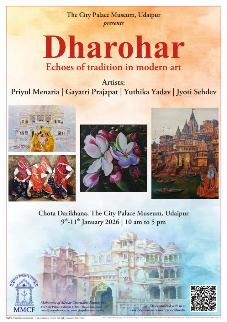 सिटी पैलेस म्यूज़ियम, उदयपुर के ऐतिहासिक छोटा दरिखाना में शुक्रवार को तीन दिवसीय कला प्रदर्शनी ‘धरोहर – आधुनिक कला में परंपरा की गूंज’ का भव्य शुभारंभ हुआ। प्रदर्शनी के उद्घाटन दिवस पर कला प्रेमियों, विद्यार्थियों एवं देश-विदेश से आए पर्यटकों की उल्लेखनीय उपस्थिति रही।
