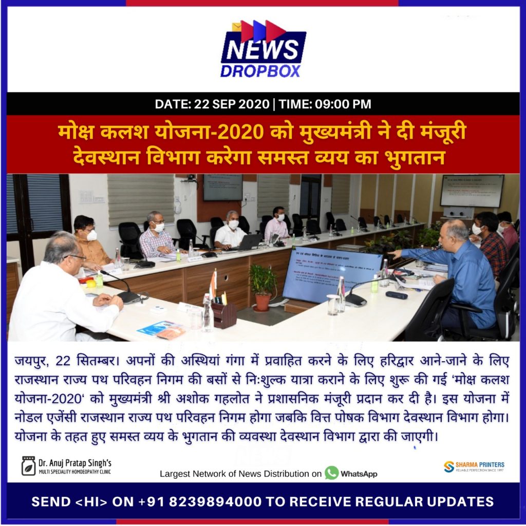 जयपुर, 22 सितम्बर। अपनों की अस्थियां गंगा में प्रवाहित करने के लिए हरिद्वार आने-जाने के लिए राजस्थान राज्य पथ परिवहन निगम की बसों से निःशुल्क यात्रा कराने के लिए शुरू की गई ‘मोक्ष कलश योजना-2020‘ को मुख्यमंत्री श्री अशोक गहलोत ने प्रशासनिक मंजूरी प्रदान कर दी है। इस योजना में नोडल एजेंसी राजस्थान राज्य पथ परिवहन निगम होगा जबकि वित्त पोषक विभाग देवस्थान विभाग होगा। योजना के तहत हुए समस्त व्यय के भुगतान की व्यवस्था देवस्थान विभाग द्वारा की जाएगी।