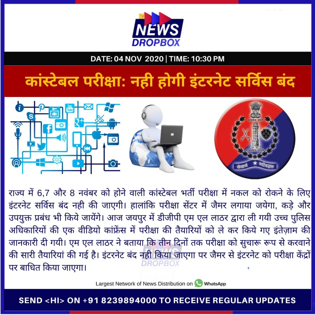 राज्य में 6,7 और 8 नवंबर को होने वाली कांस्टेबल भर्ती परीक्षा में नकल को रोकने के लिए इंटरनेट सर्विस बंद नही की जाएगी।हालांकि परीक्षा सेंटर में जैमर लगाया जयेगा, कड़े और उपयुक्त प्रबंध भी किये जायेंगे।आज जयपुर में डीजीपी एम एल लाठर द्वारा ली गयी उच्च पुलिस अधिकारियों की एक वीडियो कांफ्रेंस में परीक्षा की तैयारियों को ले कर किये गए इंतेज़ाम की जानकारी दी गयी।एम एल लाठर ने बताया कि तीन दिनों तक परीक्षा को सुचारू रूप से करवाने की सारी तैयारियां की गई है।इंटरनेट बंद नही किया जाएगा पर जैमर से इंटरनेट को परीक्षा केंद्रों पर बाधित किया जाएगा।