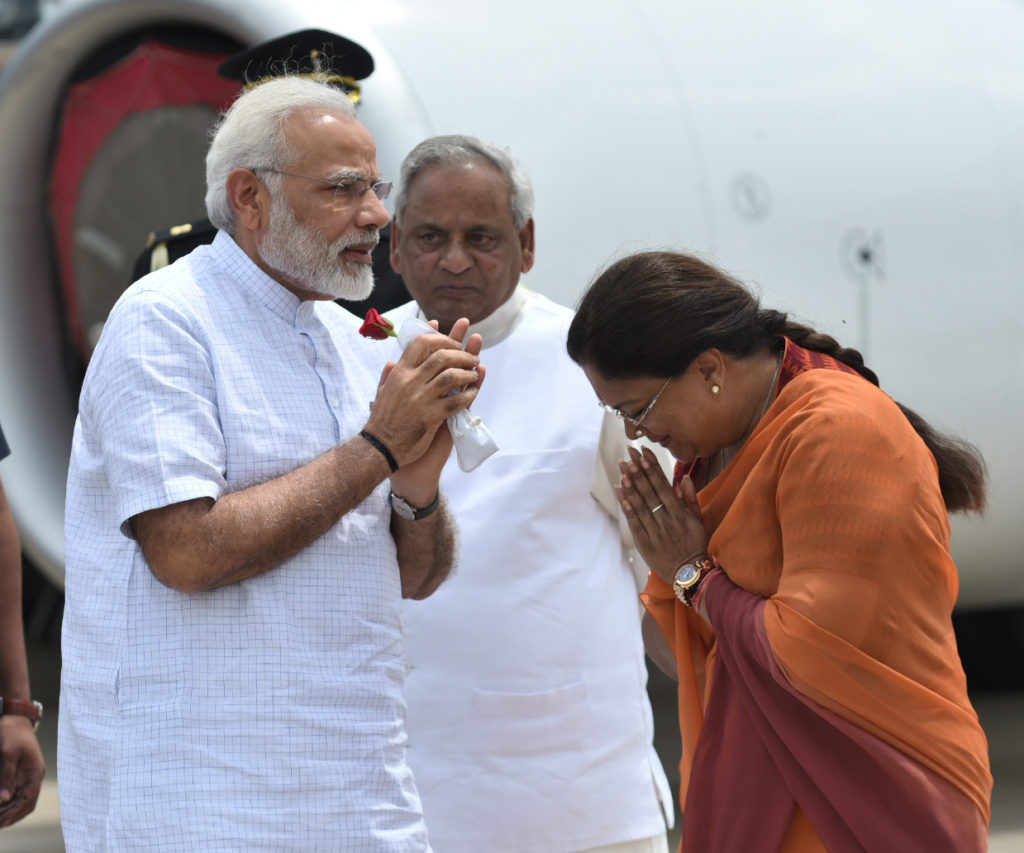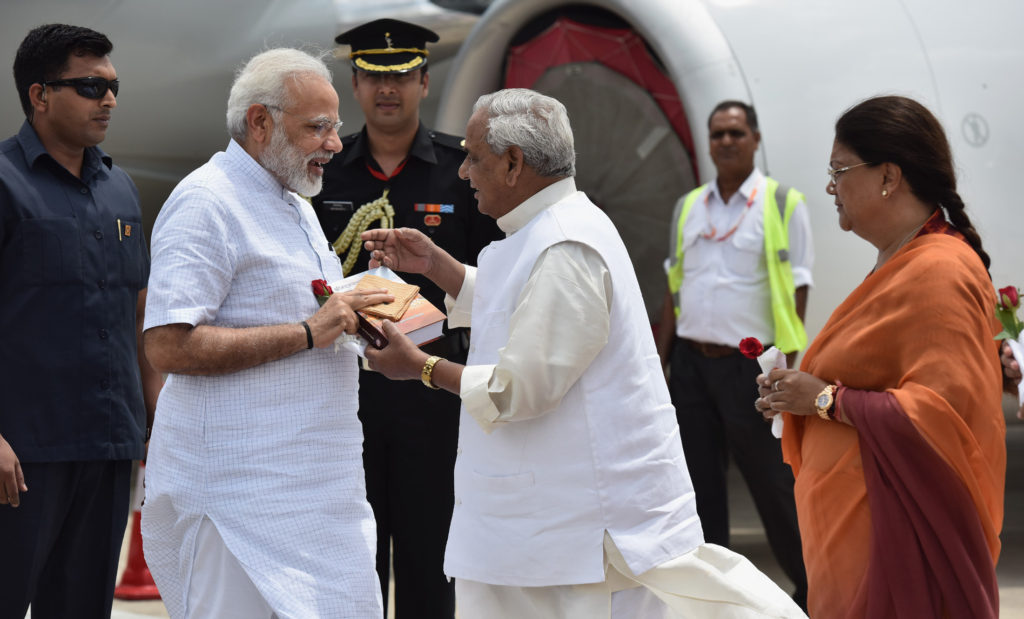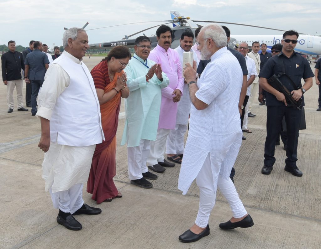 The Prime Minister, Shri Narendra Modi being received by the Governor of Rajasthan, Shri Kalyan Singh and the Chief Minister of Rajasthan, Smt. Vasundhara Raje Scindia, on his arrival, at Udaipur, in Rajasthan on August 29, 2017.